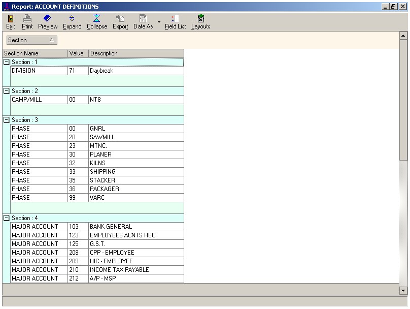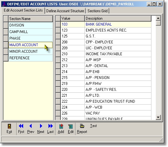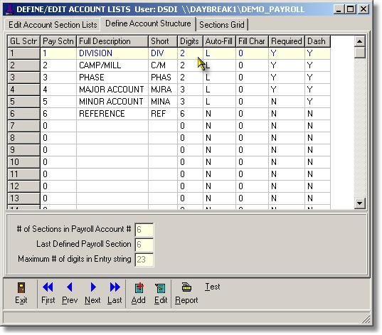 This module allows you to define the account number structure used in the payroll system to coincide with the structure as used within your General Ledger program. Once the structure has been defined you can then edit the values used for each account section.