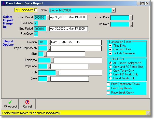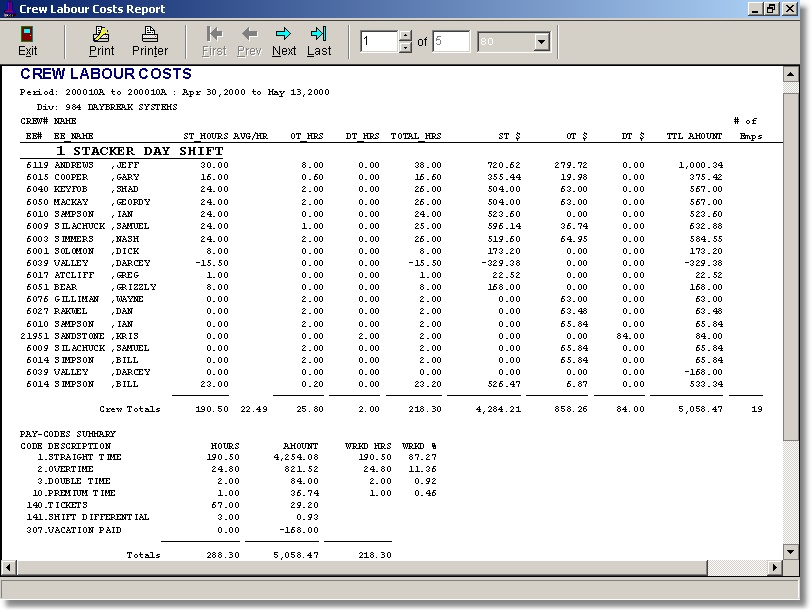 Prints straight time, overtime and doubletime hours and amounts, average cost per hour and employee count sorted by crews.