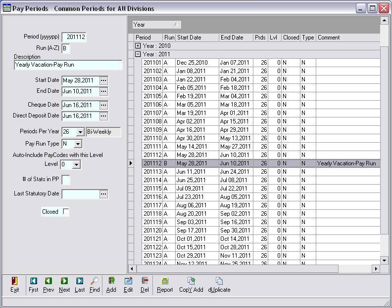 Cheque/Direct Deposit Dates: Enter the payment date(s) to be recorded in the pay records when they are created. Note: If auto-adding periods then this date may need to be changed ie; if Statutory holiday falls on a pay date and must be moved ahead, or if a bonus or vacation run must be paid on a certain date.