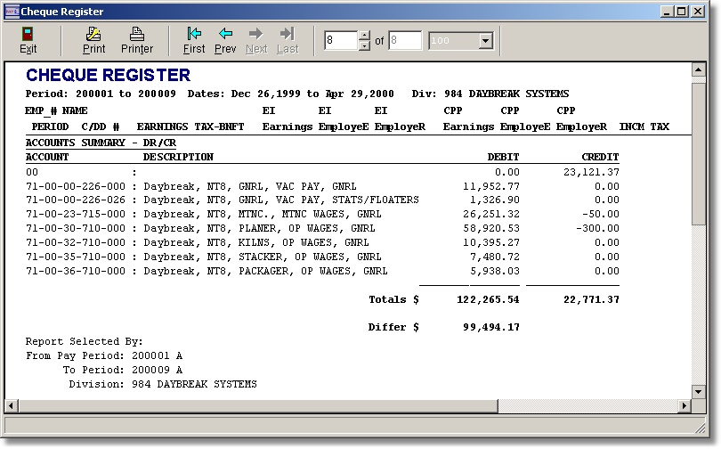 Note: the accounts summary will always show as not balanced at this point as the net-pay and benefit/deductions have not been allocated to any accounts. See the GL Journal Voucher Report for explanation.