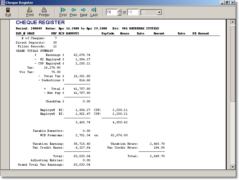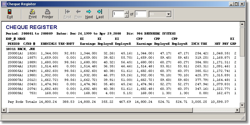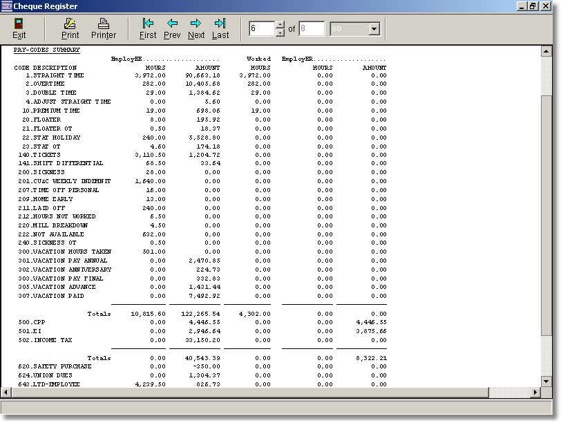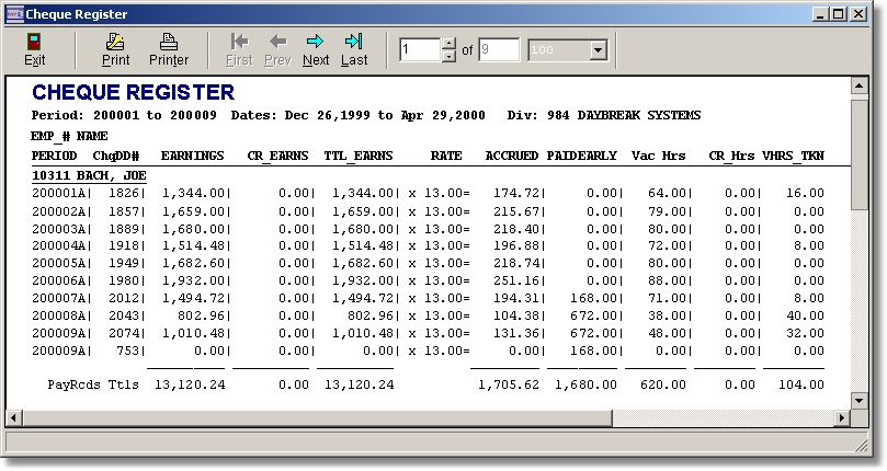 Check YTD Totals: This option totals the cheques for the entered period range and compares them to the employee's current payroll year to date totals. If there are any differences the pay records are printed with the running totals, YTD totals and differences.