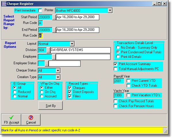 Employee Status: Leave blank for All or select employee status desired. Note: The Status restriction uses the employee's current status not his status when the cheque was created.