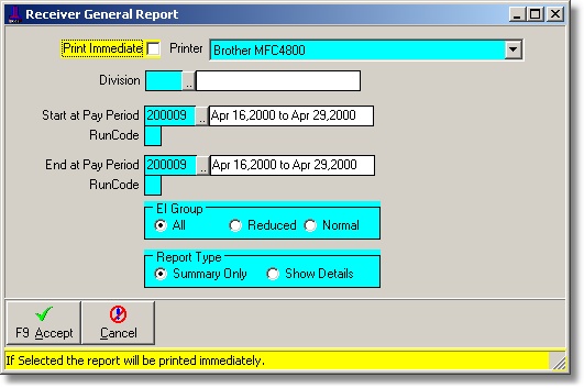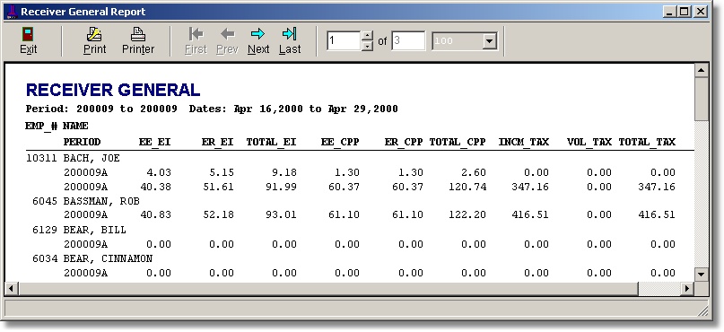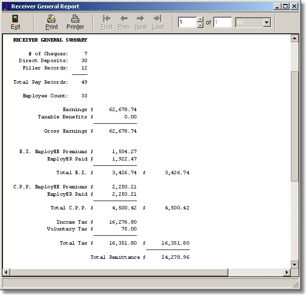This module prints the statutory amounts required for the Receiver General remittance. It my be viewed as a summary only or with employee details showing for the entered period range.